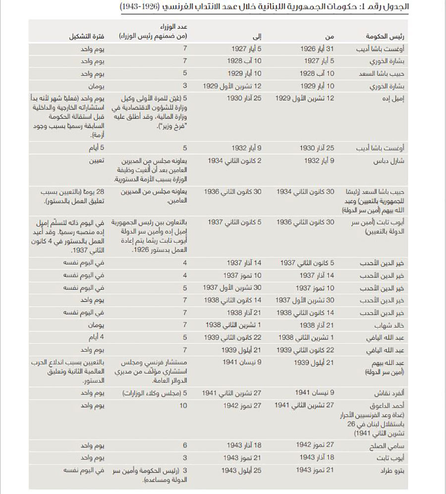 وتجدر الإشارة إلى أنّ ولاية الحكومة اللبنانية تمتد من صدور مرسوم تشكيلها حتى صدور مرسوم تشكيل الحكومة التي تخلفها، بما فيها فترة تصريف الأعمال، وهذا ما تدوّنه في سجلّاتها، لذلك عانينا بعض الصعوبات على صعيد معرفة تاريخ استقالة الحكومة فعليًا وفترة تصريفها الأعمال، وهذه العملية تطلّبت منا بحثًا في الصحف وفي مذكرات السياسيين لمعرفة فترة تشكيل الحكومة بالضبط.