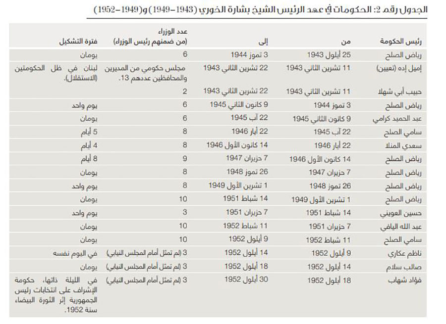 في عهد الرئيس بشارة الخوري (الجدول رقم 2)، بقيت فترة تشكيل الحكومة تراوح إجمالًا بين يوم واحد ويومين أيضًا، باستثناء مرّة واحدة 4 أيام، ومرة 5 أيام، ومرة 8 أيام. وعندما طالت فترة تشكيل الحكومة في هذه المرّات الثلاث، عمّت النقمة على الصعيدين الرسمي والشعبي.
