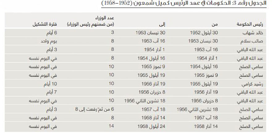 أما في عهد الرئيس كميل شمعون، فمن أصل 12 حكومة شُكِّلت 6 حكومات في اليوم ذاته، وواحدة في يومٍ، والباقية استغرق تشكيلها ما بين 3 و10 أيام. وقد تولّى سامي الصلح تأليف 5 حكومات وعبد الله اليافي 4، أما عدد الوزراء في تلك الفترة فراوح بين 8 و10 وزراء مع استثناءَين، إذ بلغ عدد أعضاء الحكومة التي ألّفها في العام 1952 خالد شهاب 3 وزراء فقط، وتلك التي شكّلها في العام 1958 سامي الصلح 14 وزيرًا (الجدول رقم 3).