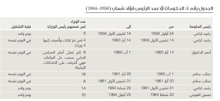 عادت الحكومات في عهد الرئيس فؤاد شهاب إلى ما كانت عليه في عهد الانتداب، أي إنّها كانت تُشكَّل في يوم التكليف، أو في اليوم الذي يليه. وقد شُكّلت خلال هذا العهد 7 حكومات ضمّت 4 منها 8 وزراء، فيما ارتفع العدد في الثلاث الباقية ليكون على التوالي 10 و14 ثم 18 في الحكومة التي ألّفها صائب سلام في العام 1960 (الجدول رقم 4).