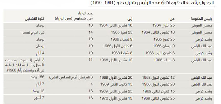 في عهد الرئيس شارل الحلو بات تشكيل الحكومات أصعب ويتطلّب مزيدًا من الوقت وذلك لأسبابٍ سياسية، فضلًا عن بدء تصدّع الوضع الأمني. وقد تم تأليف 9 حكومات 6 منها أُنجزت بسرعة، فيما بدأ التعثّر بعد ذلك وتطلّب تشكيل حكومة عبد الله اليافي سنة 1968 مشاورات على مدى 156 يومًا، ومن ثم ازدادت الأمور تعقيدًا ولم يستطع رشيد كرامي إعلان تشكيلته الوزارية سنة 1969 إلّا بعد 7 أشهر من تكليفه. وبالنسبة إلى عدد الوزراء فقد راوح بين 8 و16، فيما كان عدد أعضاء إحدى الحكومات 4 فقط (الجدول رقم 5).