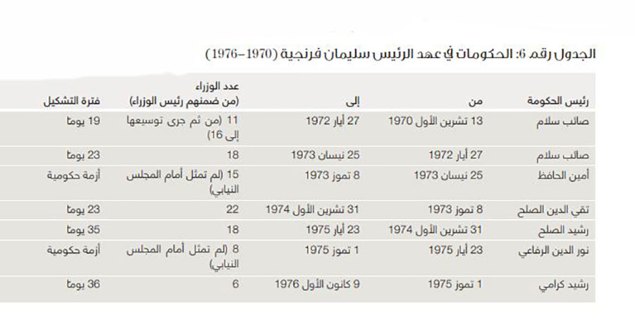 شهد عهد الرئيس سليمان فرنجية تأليف 9 حكومات، اثنتان منها لم تَمثُلا أمام المجلس النيابي (حكومة أمين الحافظ سنة 1973 وحكومة نور الدين الرفاعي في تموز 1975 أي بعد عدة أشهر من اندلاع حرب السنتين). وقد راوحت مدة التأليف بالإجمال ما بين 23 و36 يومًا. أما عدد الوزراء فاتّجه إلى التصاعد ليبلغ في حده الأقصى 22 وزيرًا (الجدول رقم 6).