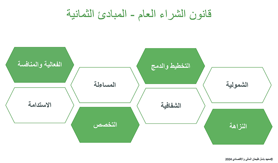 يرتكز القانون على 8 مبادئ مستوحاة من توصيات منظمة التعاون والتنمية الاقتصادية الـOECD، وهي: التخطيط والدمج، الفعالية والمنافسة، الشمولية، المساءلة، الاستدامة، النزاهة، التخصّص، والشفافية.