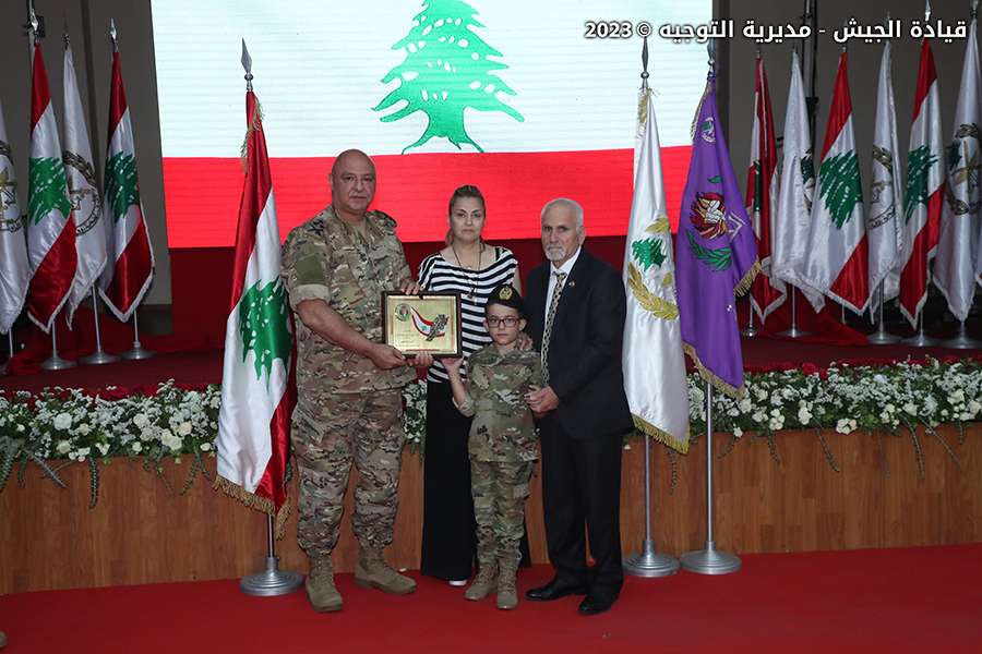 تسلّم المتخرجون شهادات الإجازة في العلوم العسكرية من قائد الجيش العماد جوزاف عون الذي قدّم الشهادة نفسها لذوي النقيب الشهيد مارون الليطاني، إضافة إلى درع تقديري رُسمت عليه خريطة لبنان. وكانت له لفتة تجاه العائلة وطفلها مارون الذي يحمل اسم عمه الشهيد، فالتقط صورة معه وكان المشهد مؤثرًا، ومعبرًا عن رسوخ العلاقة بين المؤسسة وأهالي الشهداء. وقدّم ذوو النقيب الشهيد الليطاني بدورهم دروعًا تذكارية للضباط المتخرجين طُبعت عليها صورهم مع اسم دورتهم. ثم توجّه الجميع إلى ساحة العلم وتناولوا نخب المناسبة.