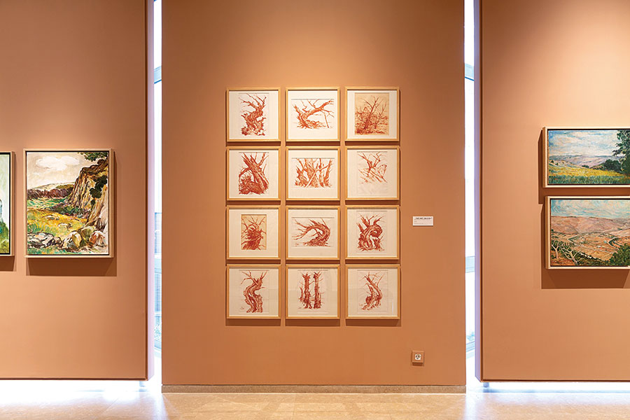 الطبيعة حاضرة بقوّةٍ في سلسلة متناغمة من لوحات الموضوع الواحد، تعكس قدرات الفنان التعبيرية في طريقة تعامله مع ألوان الصخور التي وجد فيها إشارات الثبات والاستقرار والعزلة، ومع الأشجار بجذورها القاتمة، أو تلك المقتلعة منها التي ترمز إلى التهجير والأرض المتنازع عليها.