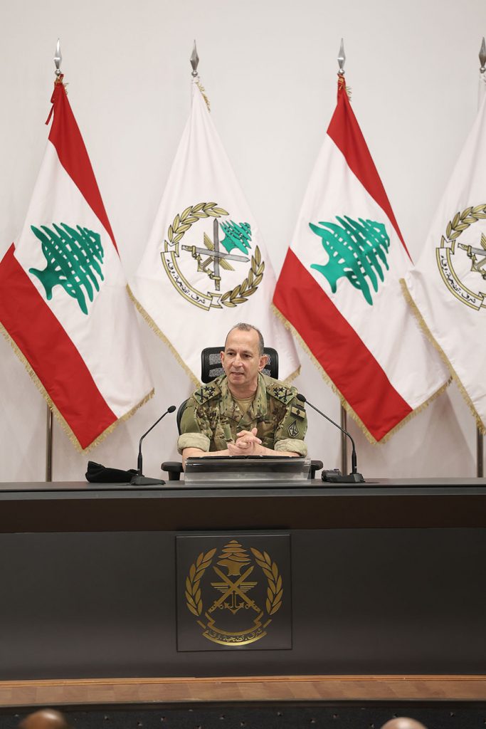 وقال: «الجيش نفذ انتشارًا واسعًا ومهمًّا في منطقة جنوب الليطاني بالتنسيق والتعاون الوثيق مع قوة الأمم المتحدة المؤقتة في لبنان – اليونيفيل، فيما لا يزال العدو الإسرائيلي يحتل عدة نقاط عقب عدوانه الأخير على بلدنا. إن استمرار الاحتلال هو العائق الوحيد أمام استكمال انتشار الوحدات العسكرية، وقد أبدى الأهالي في الجنوب تعاونًا كاملًا مع الجيش، وقيادة الجيش تتواصل باستمرار مع لجنة مراقبة وقف الأعمال العدائية (Mechanism).»
