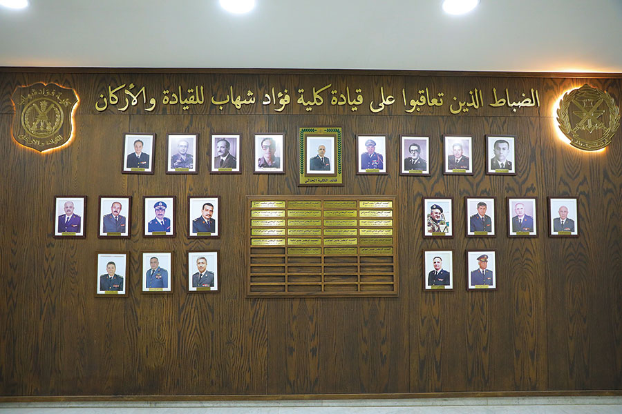 في حرم كلية فؤاد شهاب للقيادة والأركان تاريخ عمره نصف قرنٍ، تختصر أبرز مراحله لوحات معلّقة على جدار الفناء. وتسعى قيادة الكلية إلى تحويل مضمونها إلى محتوى يُعرض على شاشاتٍ رقمية بترجمات متعدّدة. بالقرب من اللوحات، وُضعت ساعة مرقّمة بالسنوات بدلًا من الأرقام، تحمل تواريخ التأسيس وتطوّرها، مع علامة «اللانهاية»، لتأكيد استمرارية مسيرة الكليّة. وفي الفناء الخاص بالمكتبة وقاعات التدريب، عرضت الكلية صورًا لأبرز محطات الجيش ومعاركه، بدءًا من معركة المالكية في العام 1948، وصولًا إلى «فجر الجرود» في العام 2017.