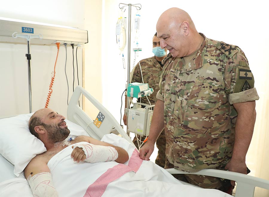 حين زاره قائد الجيش العماد جوزاف عون على أثر الحادث كان نائمًا، وكم كانت فرحته كبيرة عندما أخبره أهله أنّ العماد عون أتى للإطمئنان عليه وأمضى في المستشفى وقتًا يستوضح عن حالته من الأهل والطاقم الطبي. يخبرنا: “شعرت بفرح لا يوصف، وتناسيت أوجاعي للحظات. في وقت لاحق زاره قائد الجيش مرة أخرى وهذه المرّة كان مستيقظاً وكان فرحه كبيراً …هذا هو الجيش، في أوقات الشدة يكون الجميع حولنا. لا يمكنكم أن تتصوروا شعوري حين أرى رفاقي يتوافدون مجموعات مجموعات إلى غرفتي، يكبر قلبي… “